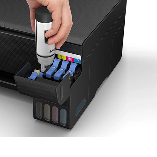 Oferece baixo custo de impressão graças ao sistema de EcoTank, que imprime até 4.500 páginas em preto e 7.500 páginas coloridas¹ com cada kit de garrafas de reposição original.